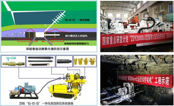 “深部开采冲击地压靶向防控关键技术与装备”基于冲击地压启动理论,建立了沿空巷道“双F大L”冲击地压发生力源结构模型,揭示了深部巷道冲击地压的动、静载力源,提出了以动、静载荷来源为靶点,深部开采靶向防控冲击地压方法。开发了“钻-切-压”一体化防冲技术与装备,一次成孔直径300mm超大转矩远程控制智能化钻进技术与装备,联排桩基阻隔防冲技术与装备;实现了对坚硬顶板动载荷源的有效控制,大幅提升了大直径钻孔对采掘工作面煤帮集中静载荷的调控效果,并解决了底板冲击问题。项目实施降低了巷道维修工程量,保障了应用矿井的安全、顺利推采,取得显著的经济和社会效益。研究成果具有广阔的应用前景。